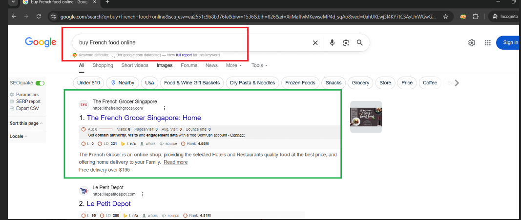 The French Grocer is already enjoying dominant search positions for high-intent terms such as: